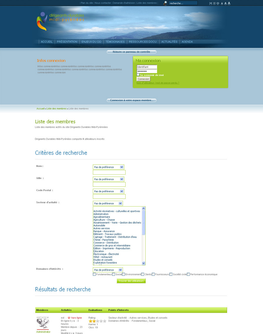 - Mise à disposition d'un moteur de recherche multi-critères (domaine d'activité, département, centres d’intérêts, etc...) de membres (le résultat obtenu est affiché selon un système de notation calculer en fonction l'activité du membre sur le site)