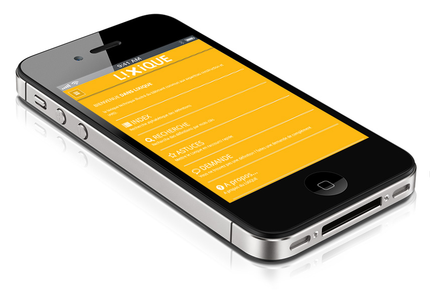 Création d'un lexique des termes métier de la construction, les quelques 200 définitions disponibles au lancement sont toutes accompagnées d'illustrations. L'application permet de rechercher les définitions par :